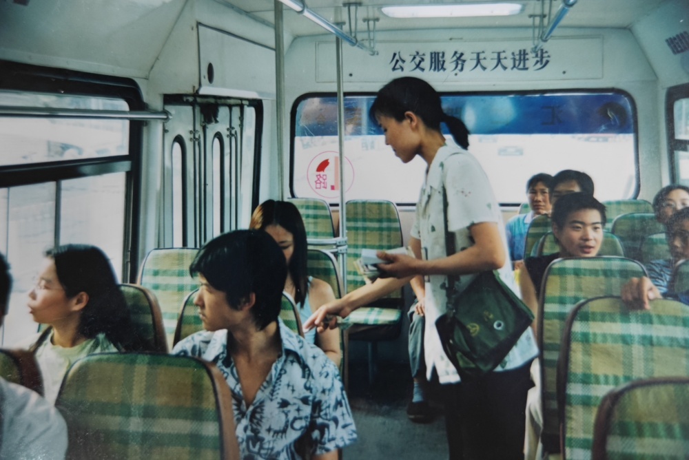 ▲90年代,公交售票員工作模樣??嬷卑种心弥沐X(qián)和車(chē)票,收錢(qián)、找錢(qián)、給票、查票行云流水。高峰期數(shù)十人上下車(chē),想要收好票款,無(wú)疑是一種考驗(yàn),而她們久經(jīng)考驗(yàn)。