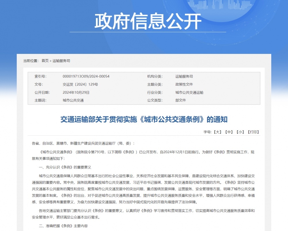 10月29日,交通運輸部網站發(fā)布《關于貫徹實施〈城市公共交通條例〉的通知》。通知提到,從充分認識《條例》的重要意義、準確把握《條例》主要內容、有力保障《條例》落地實施來貫徹實施。