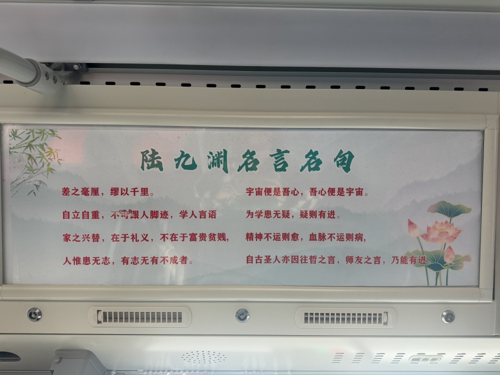 “陸九淵號”不僅僅是一條公交線路,更是一個移動文化陣地。當你踏上這趟公交車,你會被駕駛員的熱情服務所感染,他們微笑著迎接每一位乘客,以優(yōu)質(zhì)的服務彰顯著荊門的文化精神和城市溫度。車輛全部采用新能源公交車,不僅環(huán)保節(jié)能,行駛起來也更為平穩(wěn),同時,在車輛內(nèi)外裝飾以及“進站、出站、溫馨提示”等場景語音播報融入陸九淵相關元素,讓乘客潛移默化的加深對荊門文化的認識和理解。