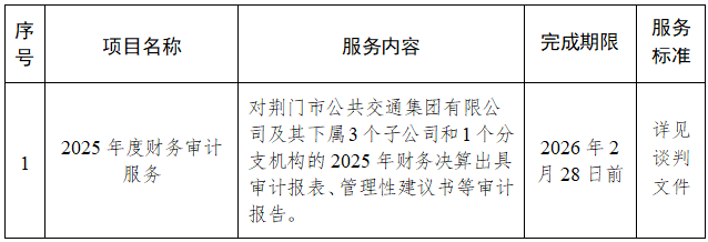 二、項目名稱:荊門市公共交通集團(tuán)有限公司2025年度財務(wù)審計服務(wù)項目